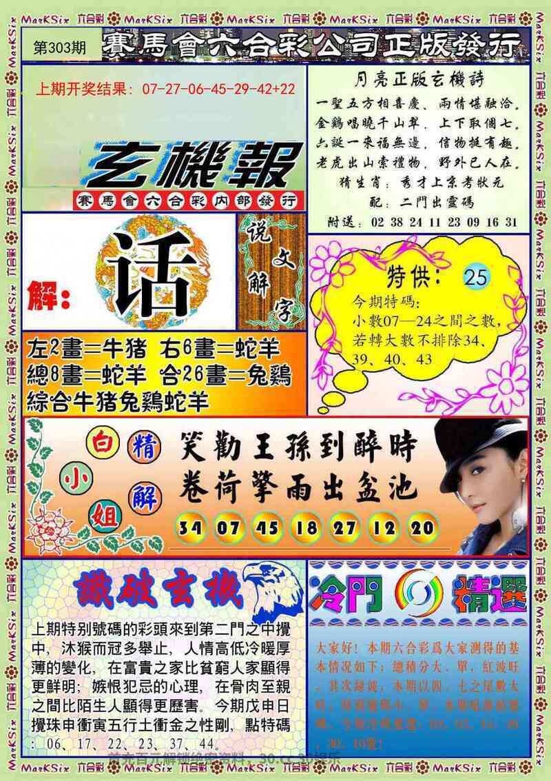 | 306期:⑩码 | 18.42.13.25.15 39.07.43.22.34 | 开:發00中 |